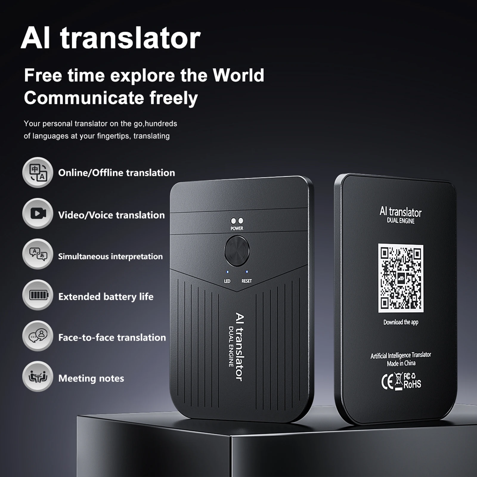 Key features include real-time voice translation, multilingual support, and intelligent recognition that adapts to different accents and speech patterns. The compact and lightweight design allows easy pocket storage, making it ideal for international travel, business meetings, or classroom use.